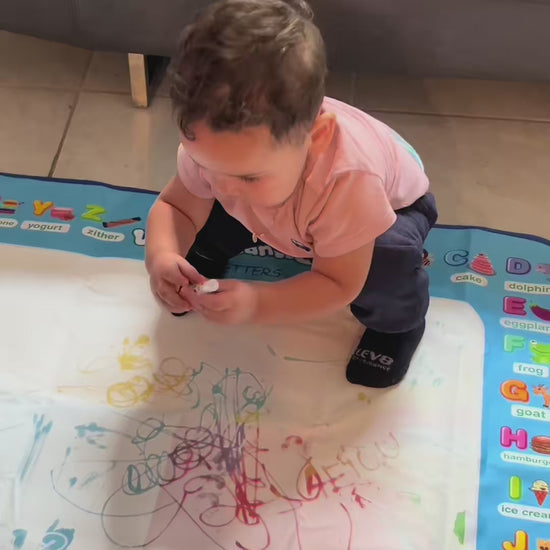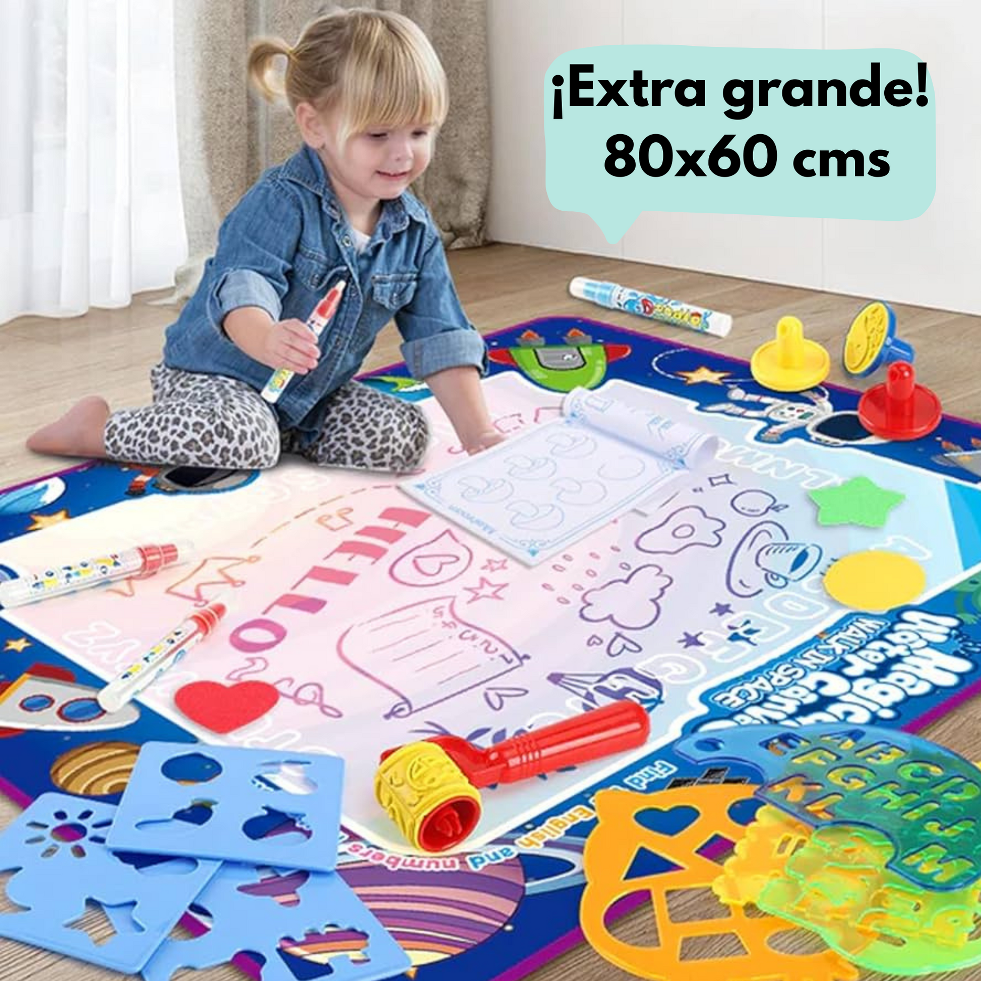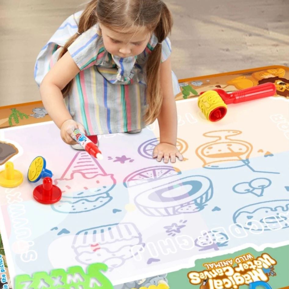 Nuestro lienzo reutilizable funciona con un lápiz que solo necesita agua. 💧 Dibujan y, a medida que el agua se evapora, ¡la imagen desaparece por arte de magia! ✨ Esto significa que pueden usarlo una y otra vez, ahorrando en papel y materiales, y tú te olvidas de las manchas y el desorden.